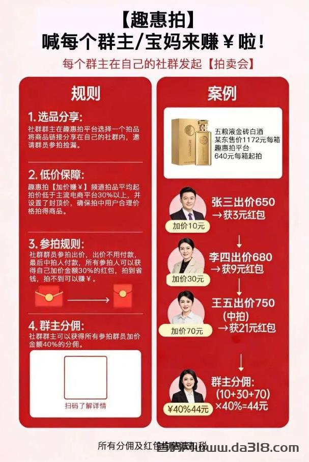 - 高佣金:用户每加价1元,你最高拿0.4元,没拍中也分佣