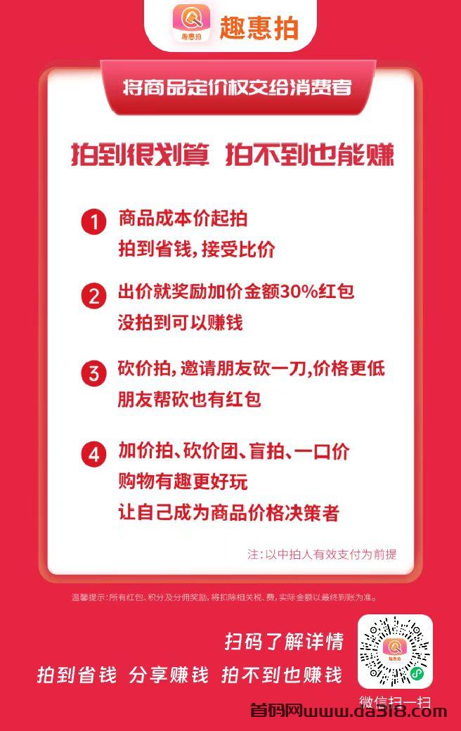趣惠拍的商品由成本价起拍,起拍价格低,消费者拍到省钱。参拍可以获得加价金额30%红包,拍不到可以赚钱,参拍出价不需要付费,只要最后中拍人付款购买,平台发货到家。