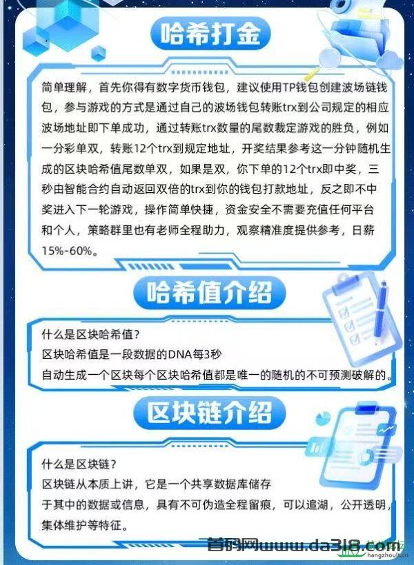 哈希乐游基于波场(TRON)区块链,每3秒生成一个新区块,游戏结果由未来第20个区块的哈希值决定。玩家可实时查询区块数据,从根源上杜绝作弊,真正实现“公开透明、不可篡改”的公平竞技!