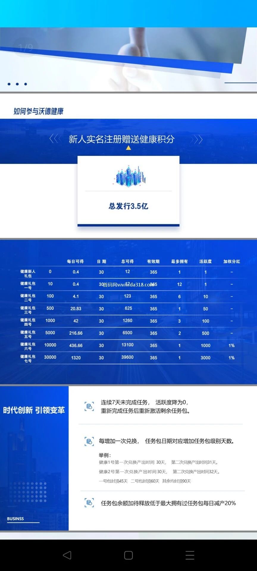 点评:维珍优创交易所关闭,数据清除。改版成为《沃德健康》。。。。。。小编没法说了。。。这算个啥。。。算跑路了吗?听说要重新注册,妥妥新开的项目。。。。这次是《沃德健康》下次是《泥德疾病》。。。刷新了小编的认知。。。