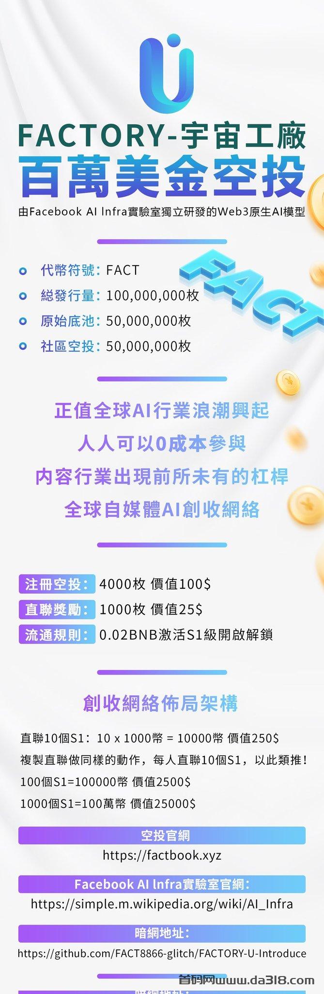头K首码绝逼项目 看懂赶紧上车 红利期 锁粉速度 纯零撸4000枚代B:无需手续费 慢一分钟多一万 首码宇宙工厂注册就送4000FACT(价值100油)直推一人送1000FACT(价值25油) 全网公排送万人团队,占位就赚web钱包和tp钱包BNB b安链打开:https://factbook.xyz/#/?code=DO5MZNC6ICCC