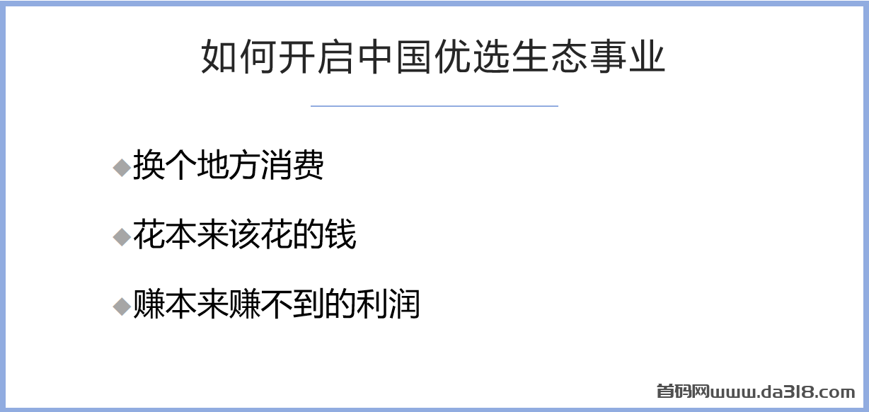 中国优选,现在知道的人很少,从做生意的角度来讲,目前市场一片空白,机会多的是,等做个三五年,在去做市场,无论是做用户,还是招代理,那就比较困难了,你在推一个人,要么是注册过了,要么就是已经买过东西,这些人因为你的推广,可能会被重新激活。但是这个产生的收益并不归你所有。所以占位很重要。
