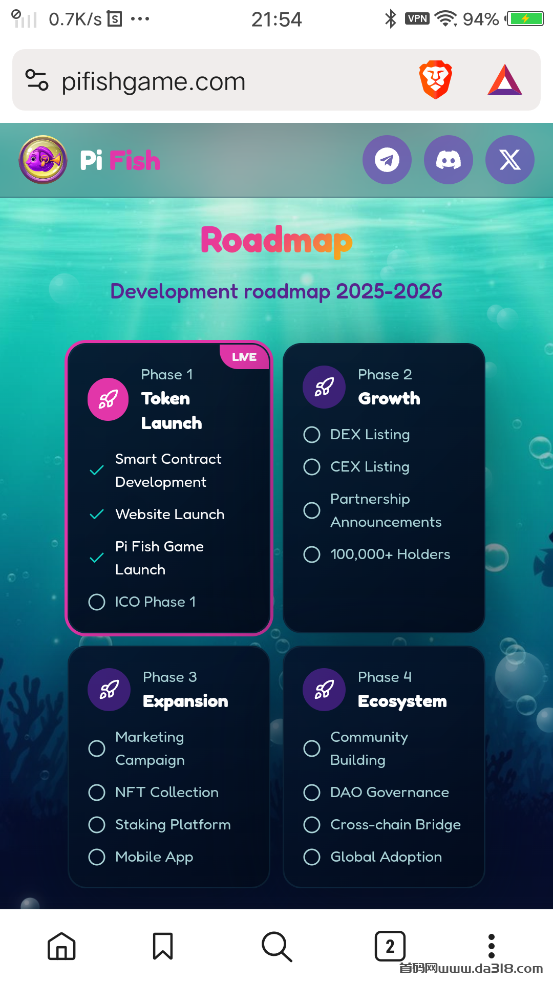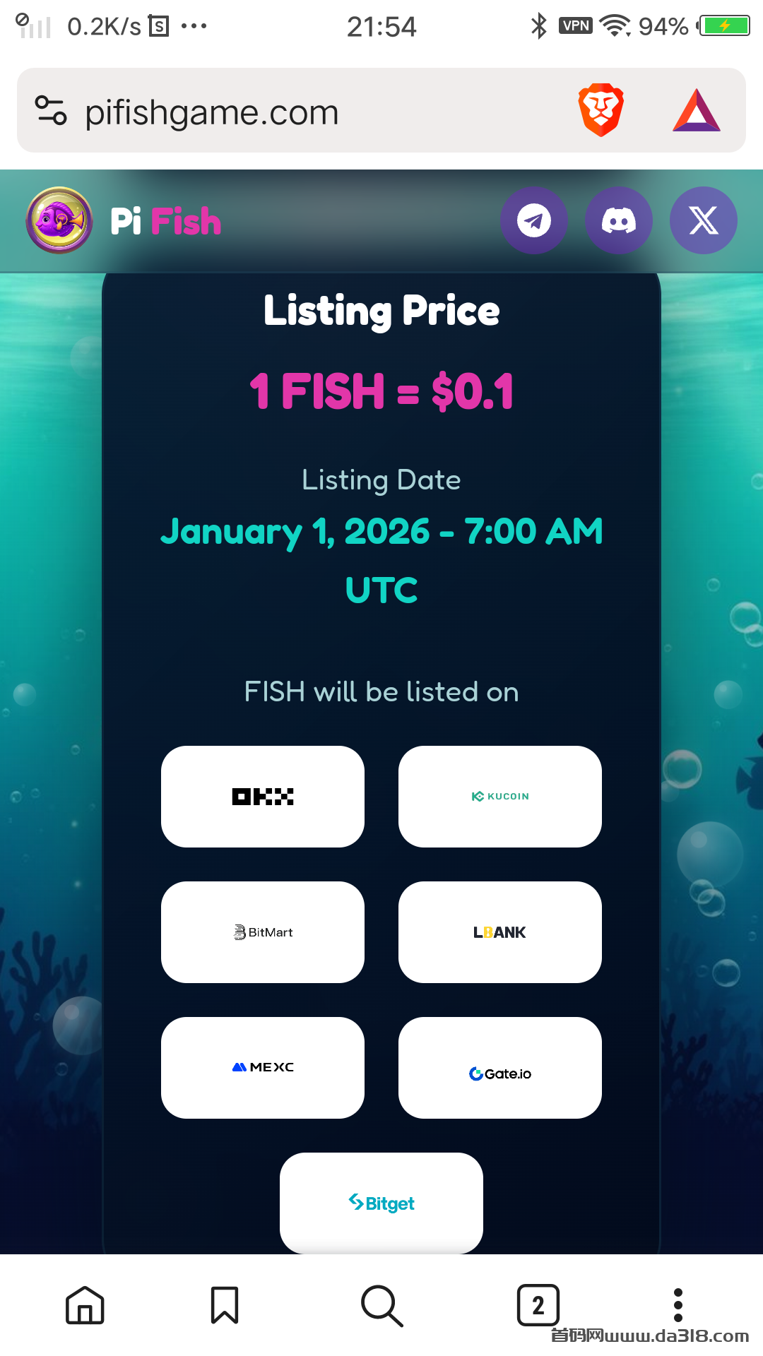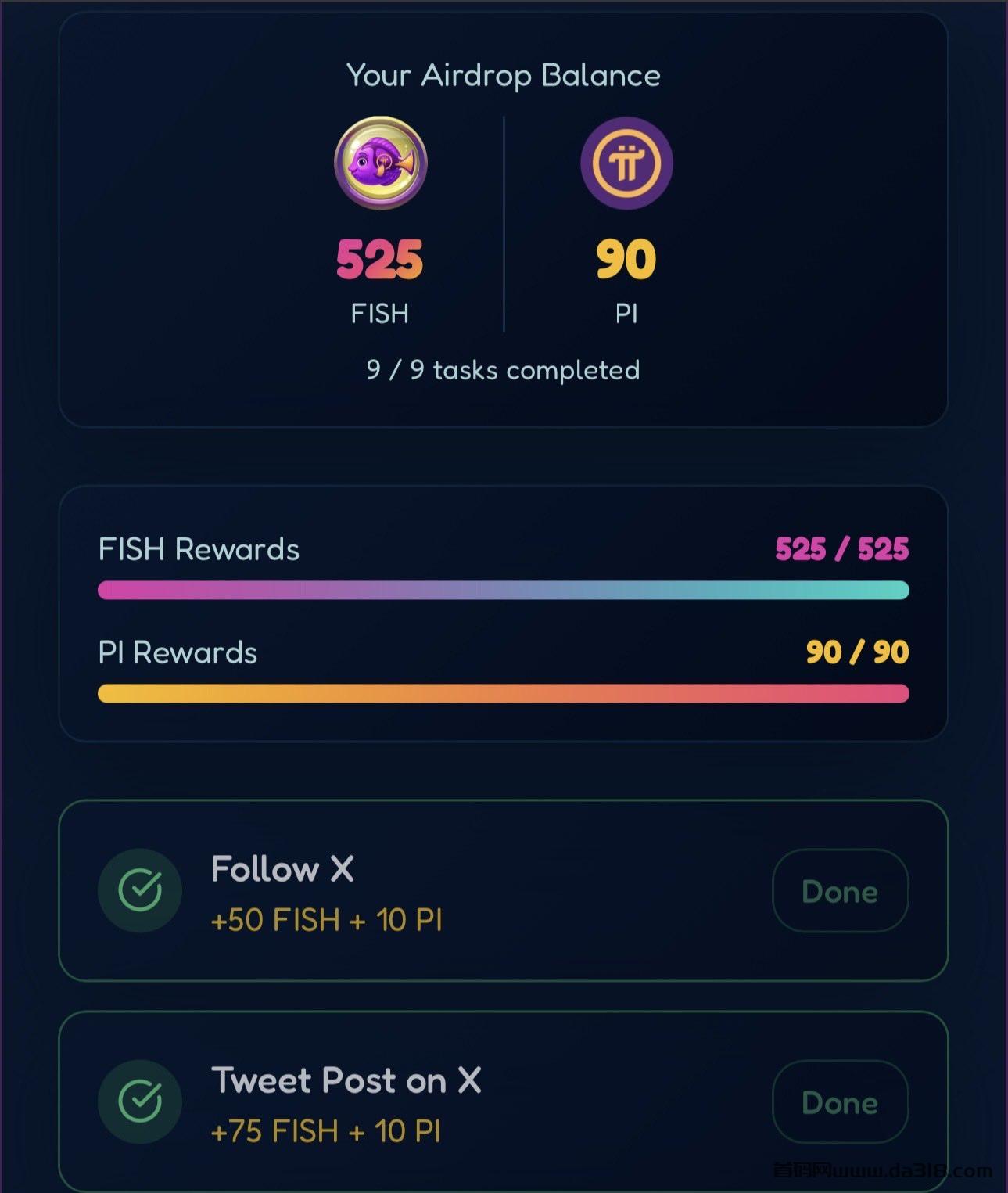 点击 AIRDROP 跳转到 Enter Your Pi Wallet Address 下方输入你的去中心化钱包OKX PI 公链地址 点击右侧钱包按钮保存好之后查看账户情况都需要输入相同的 PI 地址!完成下方所有 TWITTER X TELEGRAM DISCORD 社交任务单设备账户获取 625 FISH reward和110 PI reward ! 官方将于2025年 12 月 31 日发放全部空投币不锁仓! 次日2026年1月1日就上各大主流交易所变现! 单枚FISH币价0.1USDT或者10 FISH 兑换 1PI 点击 content rewards 上传相关视频到 TIKTOK YOUTUBE 观看量达到至少100 提交该视频链接获取至少 100 PI 点击右上方X 关闭返回主页 点进下方 Get Referral Link 输入相同PI地址 点击 generate refferal link 产生你自己的推广链接获取下级10%提成!点击右上方X 关闭返回主页Buy FISH Token 至少100PI 直接预购 1000FISH 到账!