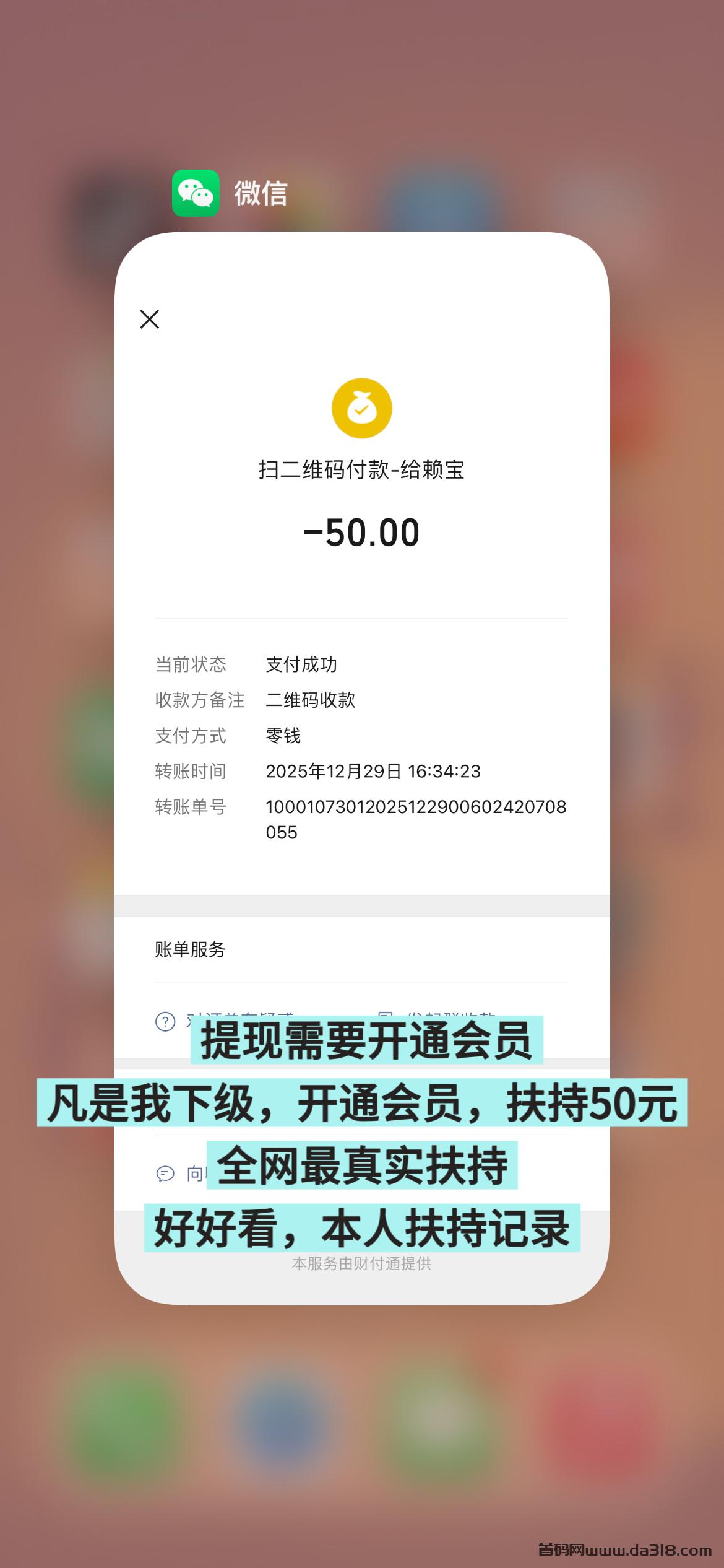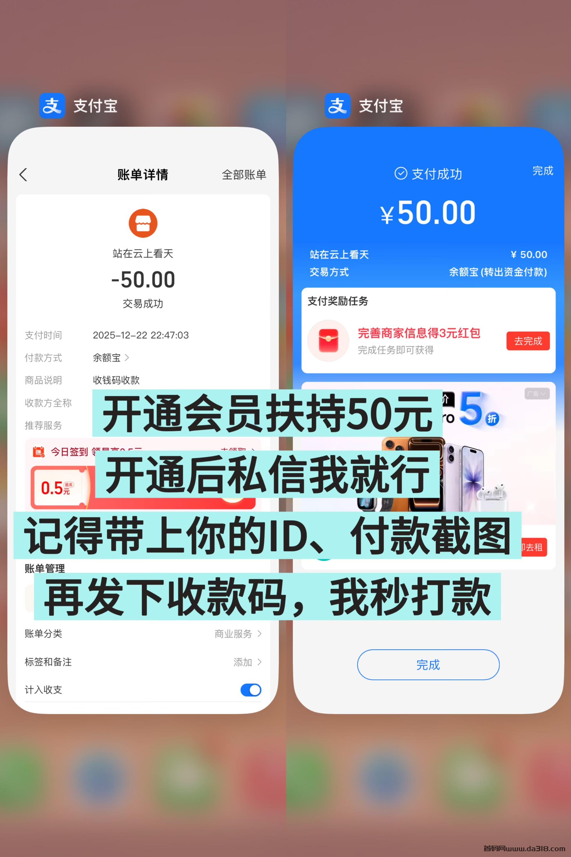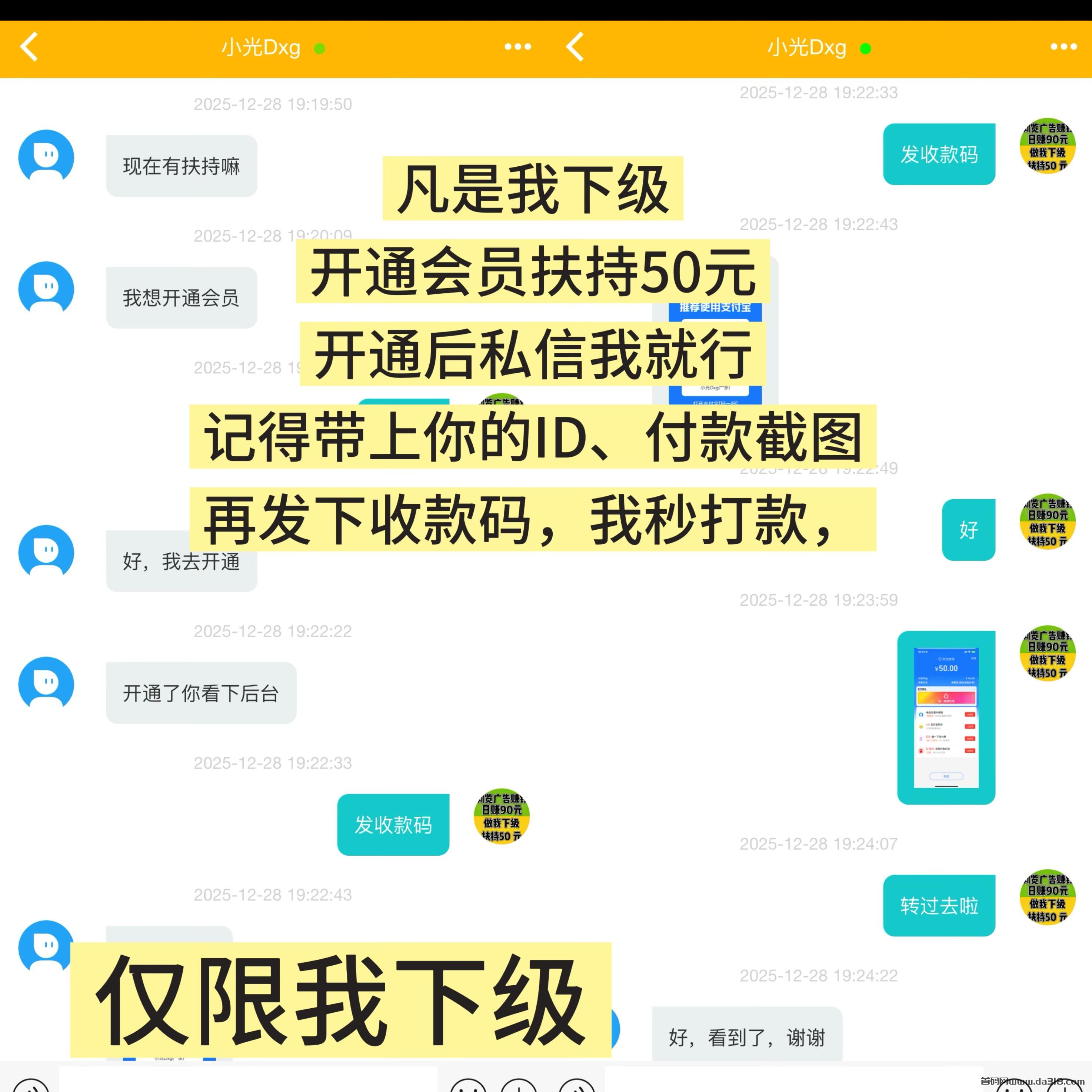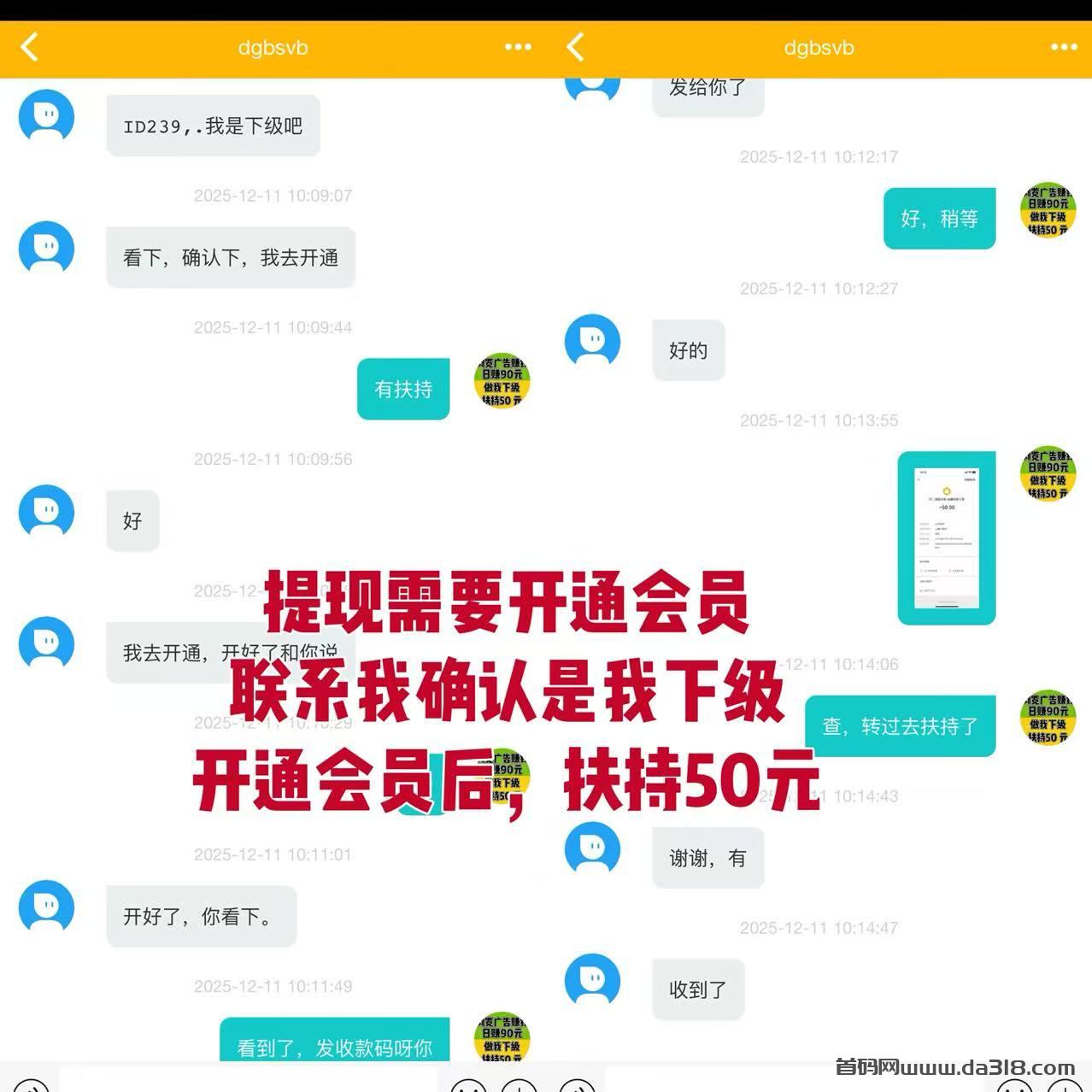 注册完成后,你可以添加我的联系方式,或者在App内私聊我。只要核实你是我直接推荐的伙伴,待你成功开通会员,我会立刻为你安排50元扶持金。